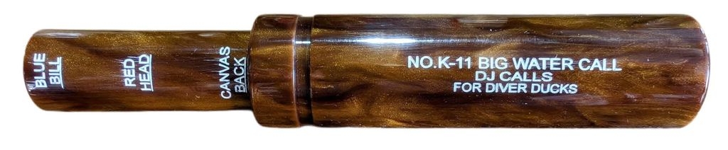 This is the first time ever the K-11 inner and outer tube has been made out of hand turned acrylic!! The call still has the hard-rubber tonal plug as the regular K-11 has. This old time slide type 3-in-1 call is marked with Bluebill, Redhead, and Canvasback. The sliding tube allows the hunter to change the tone of the call. This is a reed type call just like the former PS Olt company's was. It is also used for sea ducks. This is the best diver call on the market.